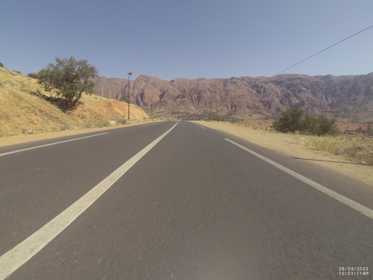Mohamed had told me breakfast would be served around 10 am because he was having a lie-in! But a colleague arrived around 8:30 and kindly offered to prepare breakfast early. I finished packing, took a shower because I was already sweating, and then had a simple but tasty breakfast. I asked for the bill: one adult, one bike, one tent, use of the washing machine, two showers, one dinner, two bottles of water, and breakfast came to 241 MAD (about 21 CHF!).