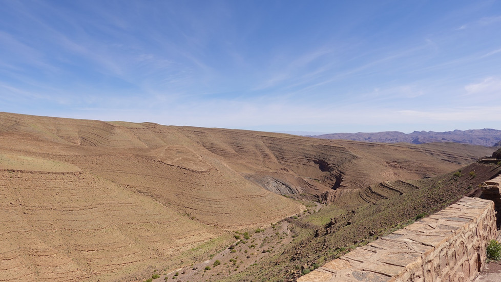 I turned at the first junction onto the N9 heading towards Ouarzazate, which I by-passed before taking the road south towards Zagora. The N9 climbs back into the Atlas, but today the highest point was only 1,230 metres. Then came the descent into the plains. The landscape changed, vegetation became sparse, and the temperature rose. I’m now at the edge of the desert, and a hot, sandy, strong wind makes riding difficult. The temperature reached 40°C, but surprisingly it was bearable.