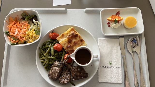 Gegen 11:30 Uhr wurde das Mittagessen serviert. Danach döste ich ein wenig, bis Deniz zu Besuch kam und mir ein paar Sachen brachte, die ich beim Packen vergessen hatte. Zusammen gingen wir in die Lounge auf einen Kaffee. Um 17:30 Uhr gab’s das Abendessen: leicht, aber schmackhaft. Wie immer sind die Mahlzeiten im Sonnenhof gut gewürzt und ansprechend angerichtet, was ich so höre, ist nicht überall selbstverständlich.